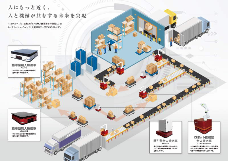その中の一例として、東京機械製作所では工場内搬送の自動化を支援するAGV・AMRをラインアップしています。